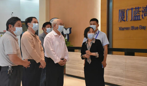 廈門藍(lán)灣科技董事長(zhǎng)林秀芬(前排右1)向廈門市關(guān)工委副主任黃家列(前排左3)、廈門市關(guān)工委副秘書長(zhǎng)蔡水妙(左1)、廈門市海滄區(qū)關(guān)工委執(zhí)行主任李大輝(左2)等介紹藍(lán)灣在海洋多糖科技的創(chuàng)新發(fā)展情況。